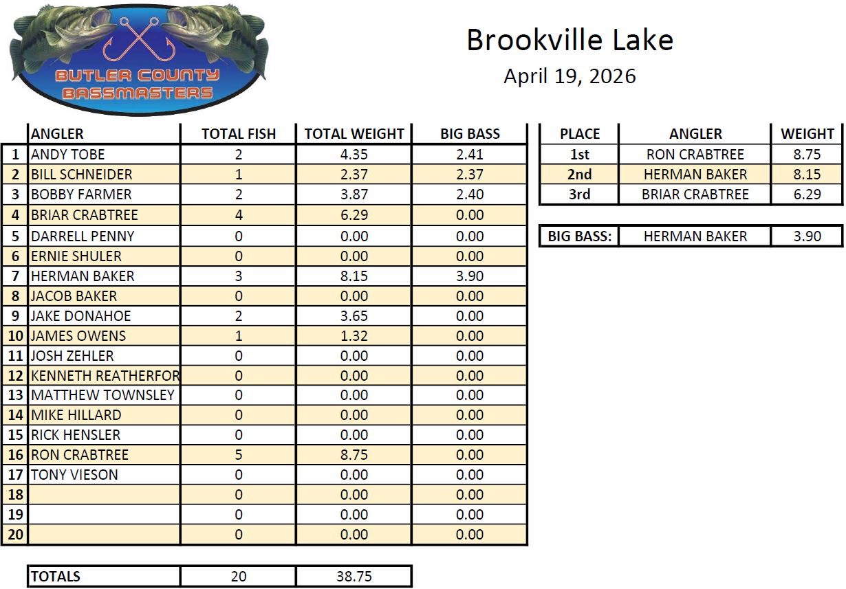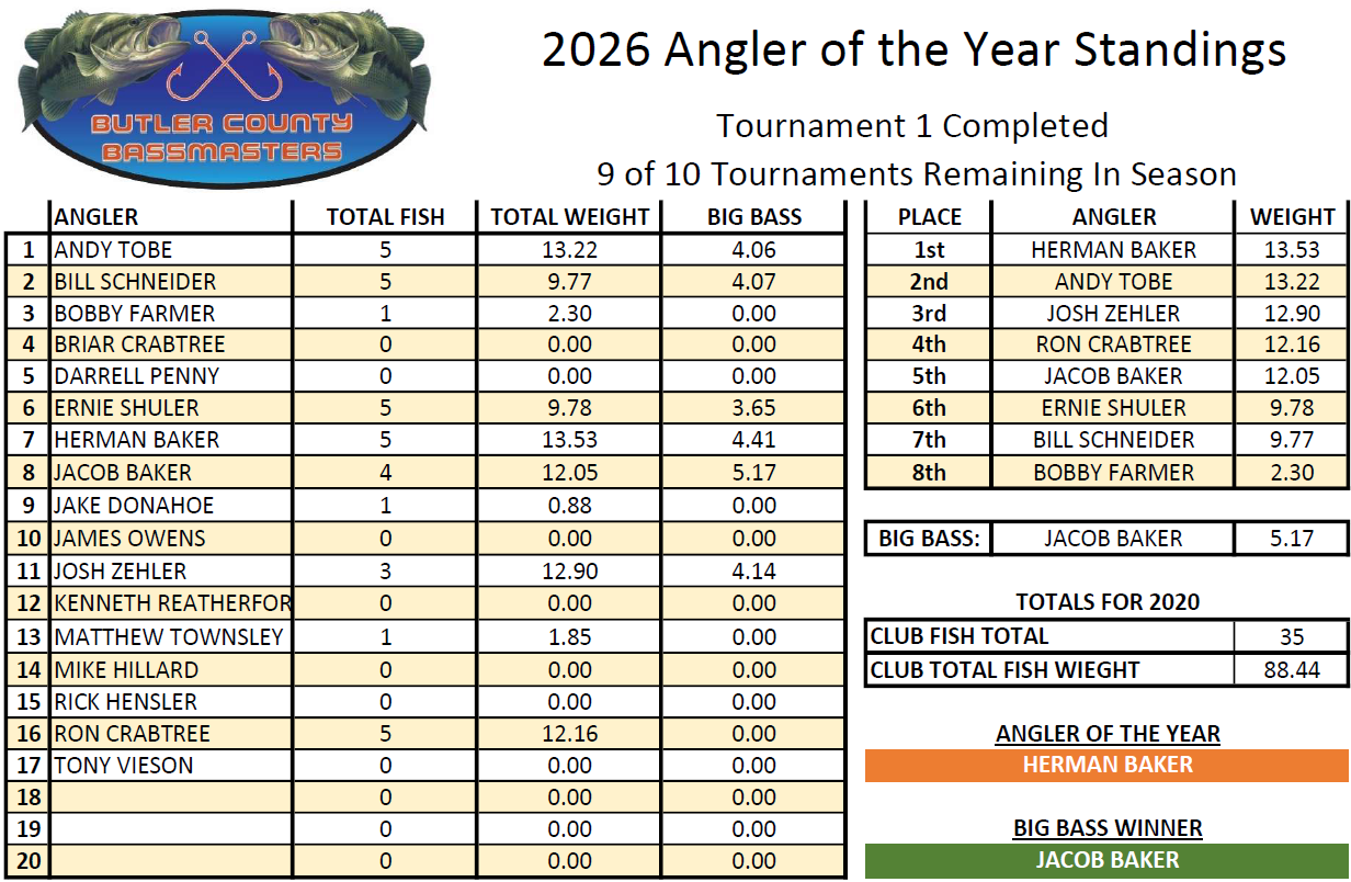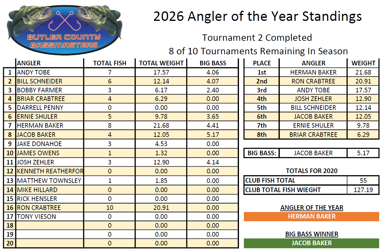 Angler of the Year - Herman Baker Big Bass (4.80 lbs) - Bobby Farmer BCB Fish Off Winner - Andy Tobe2026 Tournament Schedule